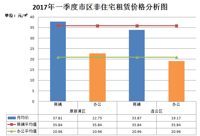 2017年一季度,我市市区住宅租赁月均价为14.66元/㎡,商铺租赁月均价为35.84元/㎡,办公租赁月均价为20.96元/㎡。